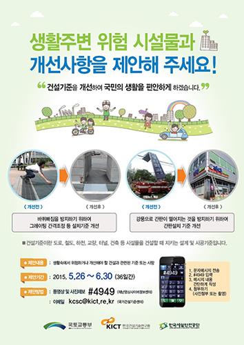 국토교통부는 국민이 생활 속에서 발견한 위험 시설물이나 시설물 관련 개선사항을 휴대전화 문자메시지(#4949번)나 이메일(kcsc@kict.re.kr)로 제안받는 캠페인을 26일부터 다음 달 30일까지 진행한다고 25일 밝혔다.