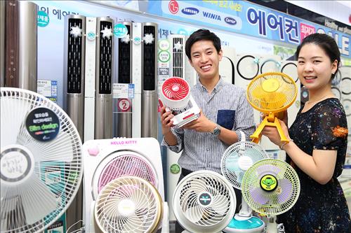 특히 기온이 33도까지 오른 대구지역의 에어컨 판매는 50%, 강원 영동지역의 에어컨과 선풍기 판매는 각각 110%, 190% 증가했다.