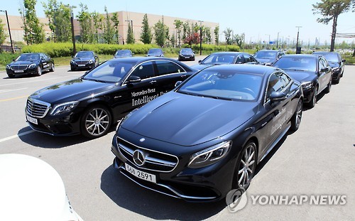 | △ 벤츠 인텔리전트 드라이브 시연 (고양=연합뉴스) 김승두 기자 = 메르세데스-벤츠 코리아가 26일 일산 킨텍스에서 플래그십 모델 S 클래스를 통해 혁신적인 인텔리전트 드라이브(Intelligent Drive) 기술을 소개하는 워크숍을 개최했다. 이날 드라이브 시연을 위해 벤츠 자동차들이 준비된 모습. 2015.5.26 kimsdoo@yna.co.kr |