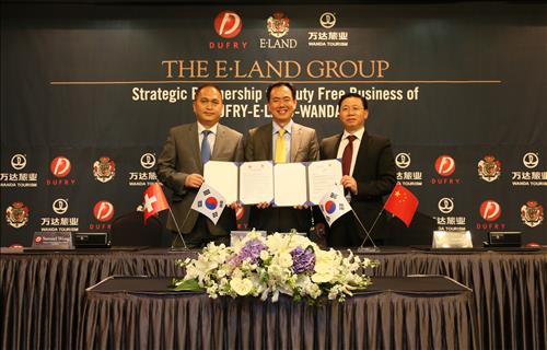 이를 위해 최근 이랜드는 여의도 렉싱턴호텔에서 듀프리 아시아태평양 총괄사장 사무엘 왕(Samuel Wong), 중국 완다그룹 부회장 겸 여행사 대표 모예밍과 '이랜드 면세사업 지원을 위한 협약'을 체결했다.