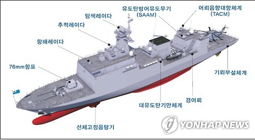 △ 3천t급 차기 기뢰부설함 '남포함' 진수 (서울=연합뉴스) 27일 울산 현대중공업에서 진수식을 하는 해군의 차기 기뢰부설함인 '남포함'의 형상 및 제원 이미지. 3천t급인 남포함은, 승조원 120명, 길이 114m, 전폭 17m, 높이 28m, 최대속력 23노트로 전시에 주요 항만과 핵심 해역 방호를 위한 보호기뢰 부설과 기뢰전 전대의 기함 임무를 수행하게 된다. 2015.5.27 << 해군 제공 >> photo@yna.co.kr