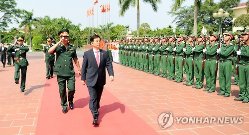 | △ 베트남 육군 기계화사단 방문한 한민구 장관 (서울=연합뉴스) 한민구 국방장관이 27일(현지시간) 베트남 육군 308기계화보병사단을 방문해 의장사열을 받고 현지 부대 장병들을 격려하고 있다. (국방부 제공) |