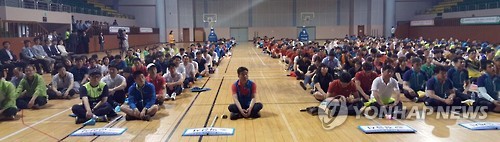 △ 외로운 익산시 공무원노조위원장 (전주=연합뉴스) 김동철 기자 = 27일 전북 전주 화산체육관에서 열린 '제7회 전북도 공무원 노사 한마음 체육대회'에 익산시 대표로 김상수(55·가운데) 익산시 공무원노조위원장 1명만이 참여했다. 익산시는 행정 공백을 이유로 시 공무원들의 대회 참여를 허락하지 않았다. 2015.5.27 sollenso@yna.co.kr