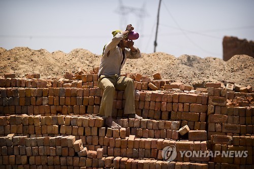 | △ 27일(현지시간) 인도 뉴델리 외곽 가세라에 있는 벽돌공장에서 한 노동자가 물을 마시고 있다.(AP=연합뉴스) |