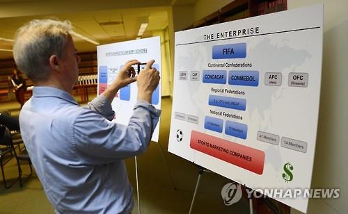 △ 미국 법무부가 국제축구연맹(FIFA) 뇌물스캔들에 연루된 FIFA 전현직 간부와 주변인 등 14명에 대한 기소 방침을 밝힌 27일(현지시간) 한 기자가 검찰이 공개한 조직도 사진을 찍고 있다.(EPA=연합뉴스)