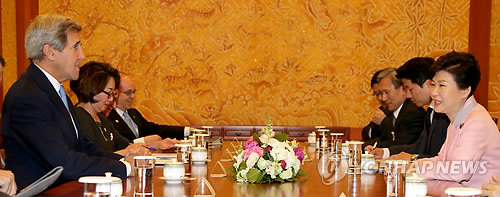 △ 박근혜 대통령이 지난 18일 오전 청와대에서 한미 외교장관 회담 등의 일정으로 방한한 존 케리 미국 국무장관을 접견하고 있다. 2015.5.18