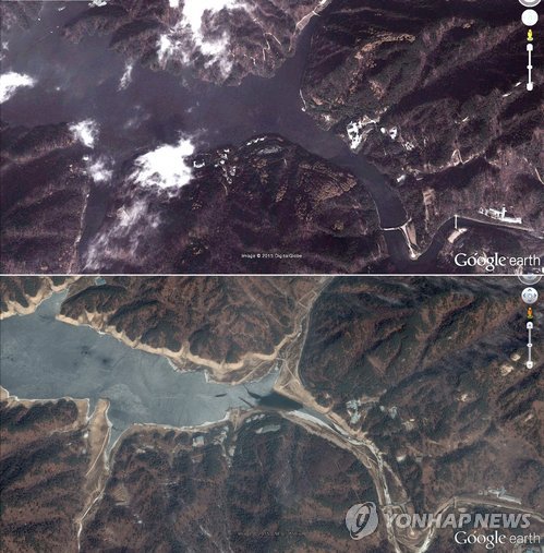 △ 북한이 극심한 가뭄을 겪고 있어 김정은 북한 국방위원회 제1위원장이 수상 스포츠를 즐길 때 이용하는 별장이 있는 평안북도 창성군을 비롯해 여러 지역에서 호수나 저수지가 바닥을 드러내고 있는 것으로 확인됐다. 구글어스 위성사진을 보면 창성군의 2012년 사진(위)은 물이 가득 차 있는 모습이지만 2014년 사진(아래)은 가뭄으로 메말라 여기저기 바닥이 보이고 있다. 2015.5.28<<구글/연합뉴스>>