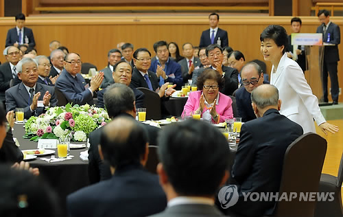 △ 박근혜 대통령은 지난 14일 청와대 연무관에서 열린 이북도민 대표단과의 대화에서 북한 인권문제를 직설적으로 비판했다. 2015.5.14