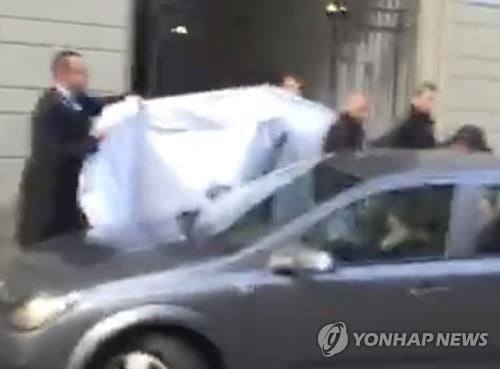 △ 체포된 FIFA 간부들이 호텔 옆문으로 빠져나가는 동안 호텔 직원들이 침대 시트로 가려주고 있는 장면을 촬영한 휴대전화 동영상 캡쳐했다. (AP=연합뉴스)