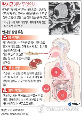 28일 질병관리본부와 전문가들에 따르면 흔히 '공포의 백색가루'로 불리는 탄저균은 탄저(Antrax)의 원인균으로, 원래는 초식동물인 소, 양, 말 등에서 급성의 폐사성 전염병을 일으킨다. 사람은 감염된 동물이나 감염 동물의 조직에 노출됐을 때 생길 수 있다.