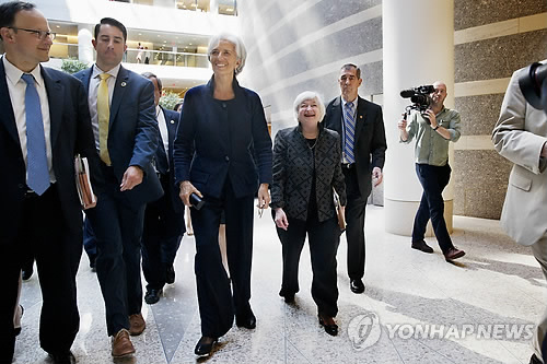 △ 라가르드·옐런, 금융권 과도 보상에 '일침' (워싱턴 AP=연합뉴스) 세계 경제의 두 여성 지도자인 크리스틴 라가르드 국제통화기금(IMF) 총재와 재닛 옐런 미국 연방준비제도(연준) 의장이 6일(현지시간) 미국 워싱턴DC IMF 본부에서 열린 '금융과 사회' 토론회에서 금융위기 이후에도 여전한 금융권의 과도한 보상체계를 개선하라고 한 목소리로 주문했다. 사진은 라가르드(가운데)와 옐런(라가르드 오른쪽)이 이날 토론회를 끝내고 회의장 밖으로 나가고 있는 모습. marshal@yna.co.kr International Monetary Fund (IMF) Managing Director Christine Lagarde, center, and Federal Reserve Chair Janet Yellen, laugh as they walk together after speaking at the Institute for New Economic Thinking Conference on Finance and Society, Wednesday, May 6, 2015, at the IMF in Washington. (AP Photo/Jacquelyn Martin)