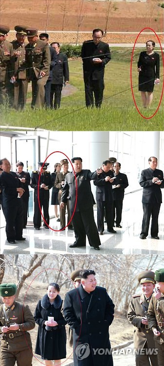 | △ 첫 번째 사진은 이날 노동신문이 보도한 것으로 앞선 3월 12일 김정은 제1위원장의 신도방어중대 시찰에 동행했을 때 사진(세 번째)과 김여정 부부장의 모습이 비교된다. 두 번째 사진은 김여정 부부장이 최근 마지막으로 공개석상에 모습을 드러냈던 지난달 12일 김정은 제1위원장의 평양 순안국제공항 제2청사 공사 현장 방문 동행 당시다. 2015.5.29 |