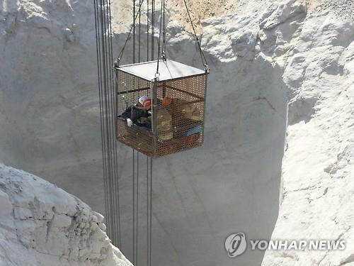 (단양=연합뉴스) 공병설 기자 = 지난 24일 충북 단양의 한 석회석업체 채석장 내 90m 깊이 수직갱도에 추락한 덤프트럭의 운전석 인양 작업에 속도가 붙고 있다.