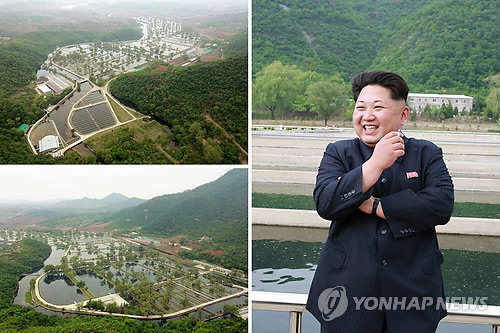 △ 북한 신창양어장과 김정은 (서울=연합뉴스) 김정은 북한 국방위원회 제1위원장이 제810군부대 산하 신창양어장을 시찰했다고 노동신문이 15일 보도했다. 김 제1위원장이 양어장에서 담배를 피우고 있다. 피우며 수행한 가운데 김 제1위원장이 환한 표정으로 웃고 있다. 2015.5.15 nkphoto@yna.co.kr