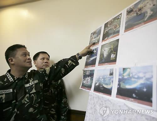 △ 2015년 4월 20일 필리핀의 마닐라 북동쪽 부대에서 열린 기자회견에서 그레고리오 카타팡 필리핀군 사령관이 남중국해 분쟁 지역에서 중국이 인공섬 매립 공사를 하는 항공 사진을 손가락으로 가리키고 있다.(AP=연합뉴스 자료사진)