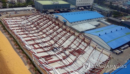 △ 무너져 내린 인천조달청 신축 창고 (인천=연합뉴스) 손현규 기자 = 31일 오전 10시 48분께 인천시 중구 신흥동 인천지방조달청 옆 신축창고 공사장에서 철골 구조물이 일부 무너졌다. 이 사고로 작업 중이던 근로자 5명이 5m 아래로 떨어져 A(53)가 숨지고 나머지 4명은 인근 병원으로 옮겨져 치료를 받고 있다. 2015.5.31 son@yna.co.kr