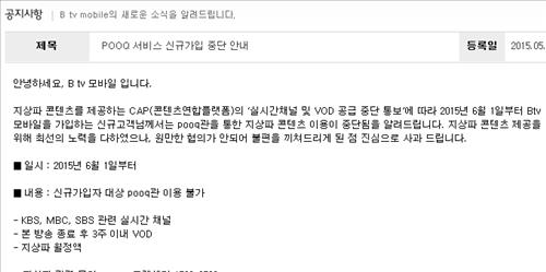 이들은 "지상파 콘텐츠를 제공하는 콘텐츠연합플랫폼(CAP)의 '실시간채널 및 VOD 공급 중단 통보'에 따라 신규고객들이 '푹(pooq)관'을 통해 지상파 콘텐츠를 이용하는 것이 중단된다"며 "지상파 콘텐츠 제공을 위해 최선의 노력을 다했으나 원만한 협의가 안돼 불편을 끼치게 됐다"고 양해를 구했다.
