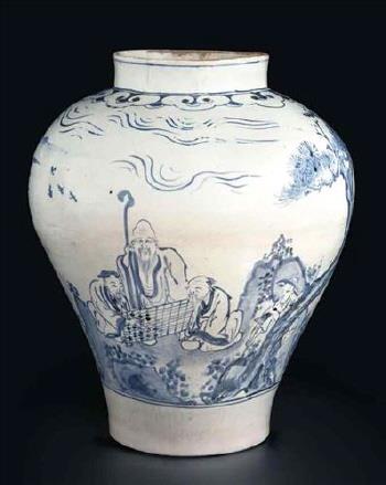 일본, 미국 등 해외에서 소장됐던 것으로 80여년 만에 공개되는 조선 시대 도자기 '백자청화송하인물위기문호'(白磁靑畵松下人物圍碁紋壺)가 출품작 최고가인 13억5천700만원에 판매됐다.