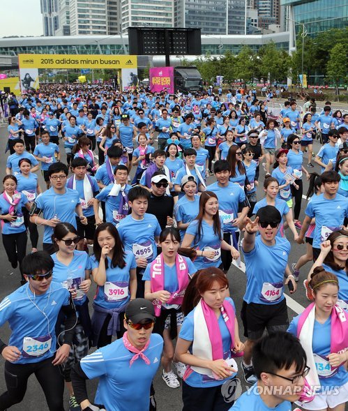 △ 2만명 참가한 '부산 달리기' (부산=연합뉴스) 조정호 기자 = 17일 부산시 해운대구 벡스코 앞에서 열린 '2015 아디다스 마이런 부산'에서 참가자들이 광안대교를 향해 출발하고 있다. 부산 시립미술관을 출발해 광안대교를 지나 광안리 해수욕장까지 10㎞를 달리는 이 행사에는 2만명이 참가했다. 2015.5.17 ccho@yna.co.kr