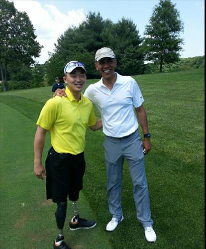 (워싱턴=연합뉴스) 노효동 특파원 = 버락 오바마 미국 대통령이 지난 30일(이하현지시간) 미국 워싱턴DC 인근의 한 골프장에서 아프가니스탄 전쟁에 참전했다가 두 다리를 잃은 한인 '전쟁영웅' 제이슨 박(24)을 만났다.