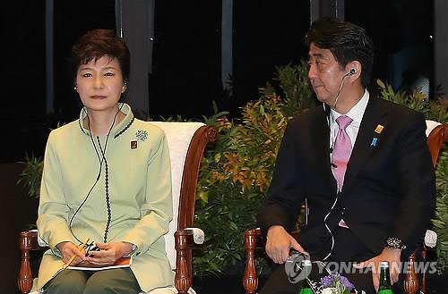| △ 2013년 10월 7일(현지시간) 인도네시아 발리 쏘피아 호텔에서 열린 APEC 기업인자문위원회와의 대화에서 아베 신조 일본 총리가 박근혜 대통령을 바라보고 있다. (연합뉴스 자료사진) |