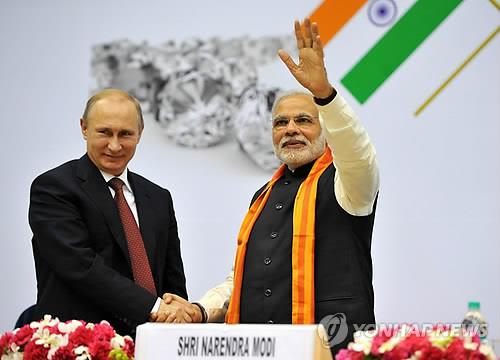 | △ 작년 12월 11일 인도 뉴델리에서 블라디미르 푸틴(왼쪽) 러시아 대통령과 나렌드라 모디 인도 총리가 악수하고 있다.(EPA=연합뉴스 자료사진) |