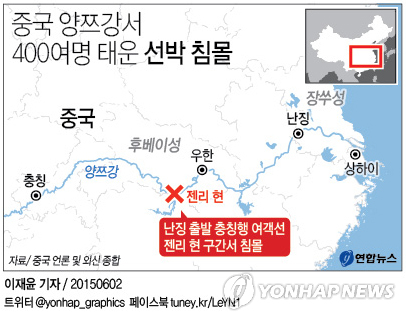 △ <그래픽> 중국 양쯔강서 400여명 태운 선박 침몰 (서울=연합뉴스) 이재윤 기자 = 중국 양쯔(揚子)강 후베이성(湖北) 젠리(監利)현 부근에서 1일 오후 9시28분께(현지시간) 440여명을 태운 선박 '둥팡즈싱'(東方之星·동쪽의 별)호가 침몰했다고 중국 관영 신화통신 등이 2일 보도했다.