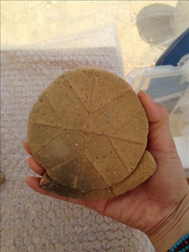 와당은 지름 10㎝ 안팎인 원형이며 테두리는 따로 만들어 붙인 것으로 드러났다. 수습 당시 흙을 말아 붙인 테두리는 분리된 상태였다. 와당 표면은 십(十)자형으로 네 등분을 한 다음, 그 각각에는 꺾쇠(∧) 모양 문양을 배치했다.