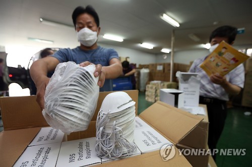 | △ 서울시, 메르스 방역물품 배부 (서울=연합뉴스) 신준희 기자 = 2일 오후 서울 성동구 용답동 서울시 예방약품비축소에서 관계자들이 메르스 의심환자와 가족들에게 배부될 N95 마스크 수량을 체크하고 있다. 서울시는 이날 각 자치구에 마스크, 손 세정제 등 메르스 관련 방역물품을 배부했다. 2015.6.2 hama@yna.co.kr |