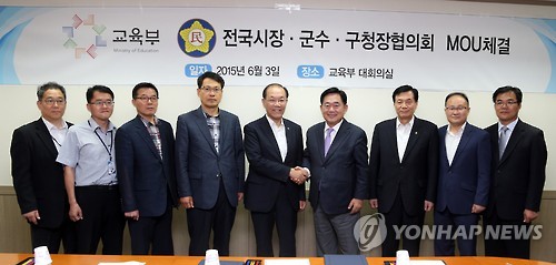 △ 교육부-전국 시장·군수·구청장협의회 MOU 체결 (서울=연합뉴스) 황우여 부총리 겸 교육부 장관이 3일 오후 정부서울청사에서 조충훈 전국 시장·군수·구청장협의회 회장(오른쪽에서 네 번째)과 중학교 자유학기제 및 진로체험활동 지원을 위한 업무협약을 체결한 뒤 기념촬영을 하고 있다. << 교육부 제공 >> scoop@yna.co.kr
