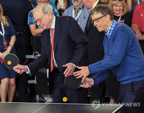 △ 버핏-게이츠 "우린 탁구 복식조" (오마하<미 네브래스카주> AP=연합뉴스) 월가 '투자 귀재' 워런 버핏은 '가치 투자' 원칙은 국경을 초월해 모든 시장에 적용되는 것이라고 강조했다. 버핏은 지난 2일 자신이 회장 겸 최고경영자(CEO)로 있는 투자회사 버크셔 해서웨이 연례 주총 일문일답에서 이같이 말했다. 버핏이 3일 빌 게이츠 마이크로소프트 공동창업자와 함께 탁구 시합에 나선 장면이다. Berkshire Hathaway Chairman and CEO Warren Buffett, left, and Microsoft co-founder Bill Gates play table tennis against prodigy Ariel Hsing, unseen, outside the Borsheims jewelry store, a Berkshire Hathaway subsidiary, in Omaha, Neb., Sunday, May 3, 2015. The annual Berkshire shareholders weekend is coming to a close one day after more than 40,000 people attended a question and answer session with Warren Buffett and his Vice Chairman Charlie Munger. (AP Photo/Nati Harnik)
