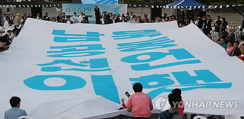 | △ 광복 70돌 준비위가 개최한 행사장에서 '남북공동선언 이행'이 적힌 대형 플래카드를 펼치는 퍼포먼스를 하고 있다. (연합뉴스 자료사진) |