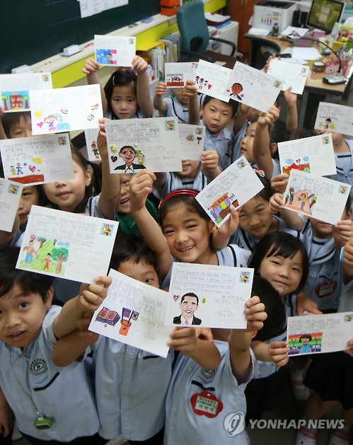 △ 백악관으로 띄우는 편지 (서울=연합뉴스) 양지웅 기자 = 4일 오전 서울 도봉구 쌍문동 한신초등학교 1학년 학급에서 어린이들이 버락 오바마 미국 대통령에게 쓴 편지를 들어 보이고 있다. 2015.6.4 yangdoo@yna.co.kr