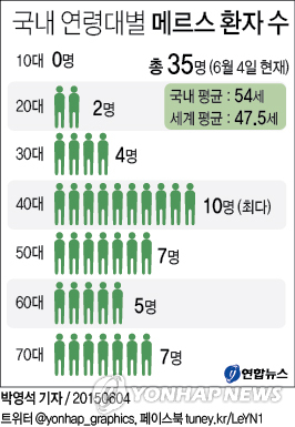(서울=연합뉴스) 오수진 기자 = 고연령층이 메르스 감염에 취약하다는 일반적인 주장과 달리 국내 메르스 환자는 40대가 10명으로 가장 많은 것으로 나타났다.