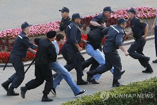 △ 벨라루스에서 소셜네트워크를 통한 혁명이라는 구호를 내세우고 시위를 하던 시민들이 경찰에 연행되고 있다.(AP=연합뉴스 자료사진)