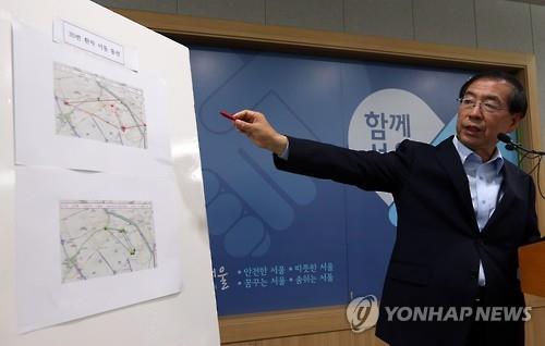 △ 서울시장, 메르스 관련 긴급 브리핑 (서울=연합뉴스) 신준희 기자 = 박원순 서울시장이 4일 오후 시청 브리핑룸에서 메르스 관련 긴급 브리핑을 하고 있다. 박 시장은 "메르스 확진 환자인 서울의 한 의사가 격리 통보에도 불구하고 1천400명 규모의 행사에 참석했다"고 밝혔다. 왼쪽 지도는 해당 환자의 이동 동선.