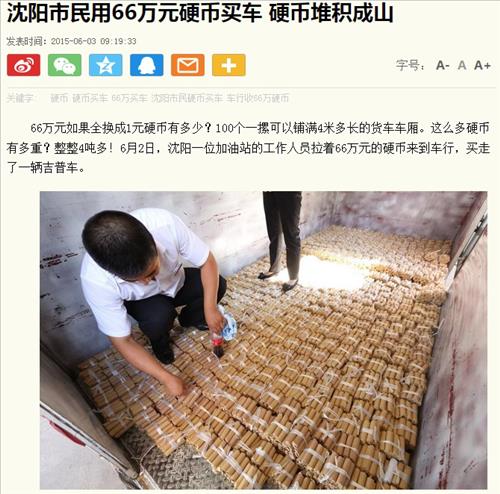 | △ 중국에서 한 남성이 새 차량을 구입하면서 동전 66만개 등 현금을 내 화제가 되고 있다. 사진은 중국 관찰자망 캡쳐. 2015.6.5 |