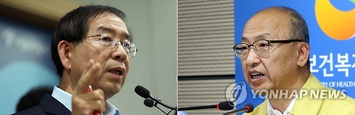 △ 문형표 장관 vs 박원순 시장 (세종 서울=연합뉴스) 배재만 신준희 기자 = 문형표 보건복지부 장관이 5일 서울시가 전날 중동호흡기증후군(메르스) 의심 의사가 최소 1천500여명 접촉했다고 발표한 것과 관련해 강한 유감을 표명했다. 오른쪽은 이날 정부세종청사에서 브리핑하는 문형표 보건복지부 장관, 왼쪽은 4일 서울시청 브리핑룸에서 메르스 관련 긴급 브리핑하는 박원순 서울시장.