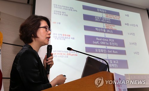 국립보건연구원 호흡기바이러스가 김성순 과장은 5일 정부세종청사에서 열린 브리핑에서 "검체 3개에 대한 검사 한 번에 7∼8시간이 소요된다"며 "기본적으로 2차례 검사가 필요하다"고 설명했다.