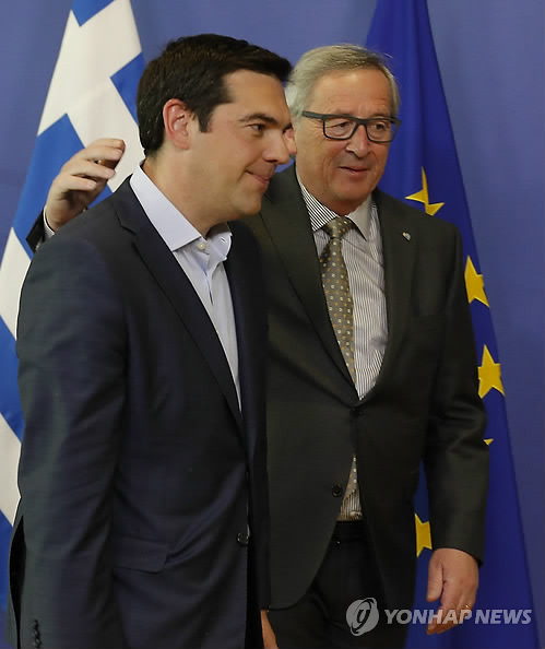 | △ 장-클로드 융커 유럽연합(EU) 집행위원장(오른쪽)과 알렉시스 치프라스 그리스 총리(EPA=연합뉴스) |