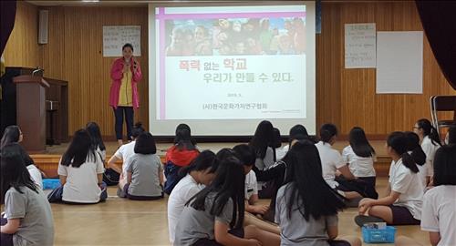 | △ 강원도 삼척 도계여자중학교 학생들이 5일 '폐광지역 초중학교 학교폭력 예방교육 및 진로체험교실'에 참가해 학교폭력 예방에 대한 강의를 듣고 있다. |