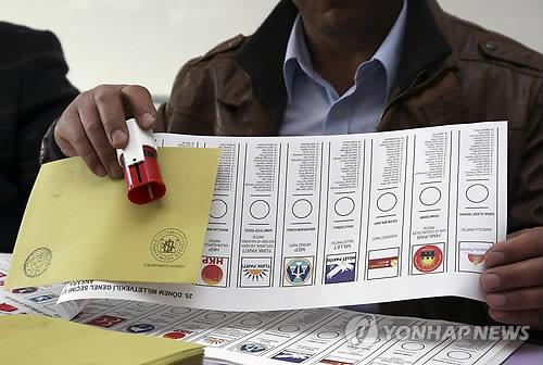 △ (앙카라 AP=연합뉴스) 터키의 새 정부 선출 총선 투표일인 7일 오전(현지시간) 앙카라의 한 투표소에서 선관위 직원이 투표용지와 스탬프 등을 준비하고 있다.