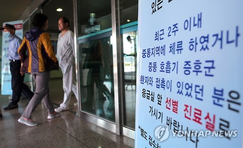| △ "메르스 접촉자는 선별진료실로" (부산=연합뉴스) 조정호 기자 = 7일 부산 첫 메르스 1차 양성반응자가 치료중인 한 병원에 메르스 접촉자와 관련한 안내간판이 설치됐다. 2015.6.7 ccho@yna.co.kr |