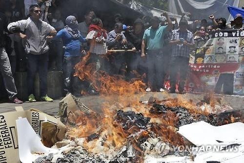 | △ 멕시코 중간선거 투표가 치러진 7일(현지시간) 남부 오악사카주에서 교육 개혁법 시행에 반대하는 교원노조원들이 투표 용지를 강탈해 불태우고 있다.(EPA=연합뉴스) |