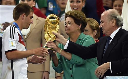 △ 지우마 호세프 브라질 대통령(가운데)과 제프 블라터 FIFA 회장이 2014년 월드컵 결승전에서 우승을 차지한 독일 대표팀 주장에게 우승컵을 전달하고 있다.