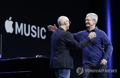 △ 애플 CEO 팀 쿡(오른쪽)과 비츠 바이 드레 공동창립자이며 애플 임원인 레코드 프로듀서 지미 아이오바인(왼쪽)이 8일(현지시간) 애플 세계개발자회의(WWDC) 2015기조연설 무대에서 포옹하고 있다. 애플은 이날 유료 스트리밍 음악 서비스 '애플 뮤직'을 발표했다. (샌프란시스코 AP=연합뉴스) (AP Photo/Jeff Chiu)