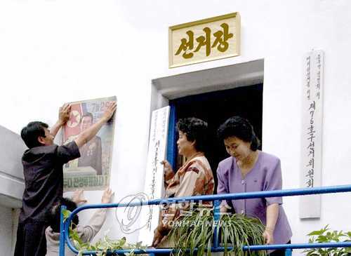 △ 평양시 중구지역 투표소에서 선거위원회 관계자가 선전화를 붙이고 있다. (연합뉴스 자료사진)