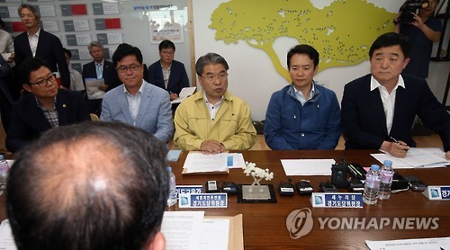 | △ 메르스 관련 경기도 대책 회의 (수원=연합뉴스) 신영근 기자 = 4일 오후 경기도 수원 경기도청에서 남경필 경기도지사(오른쪽에서 2번째), 이재정 경기도교육감(오른쪽에서 3번째), 강득구 경기도의회 의장(오른쪽) 등이 참석한 가운데 중동호흡기증후군(메르스) 사태에 대응하기 위한 경기도 대책회의가 열리고 있다. 2015.6.4 drops@yna.co.kr http://blog.yonhapnews.co.kr/geenang |