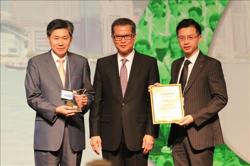 | △ 삼성물산 SCL 1109 지하철 현장이 홍콩 정부와 건설협회가 주관하는 21회 모범 현장상에서 최우수상(Gold Award)을 수상했다. 삼성물산 시빌사업부 김응태 상무(왼쪽 첫 번째)가 홍콩개발부 폴 챈(Paul Chan, 가운데) 장관으로부터 기념패를 받고 있다. 삼성물산 제공. |