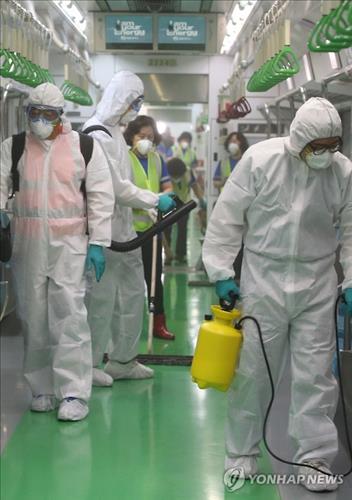 | △ 5일 오후 서울 양천구 서울메트로 신정차량기지에서 방역업체 직원들이 메르스 예방 대책의 하나로 살균소독 및 방역작업을 하고 있다.<<연합뉴스 자료사진>> |